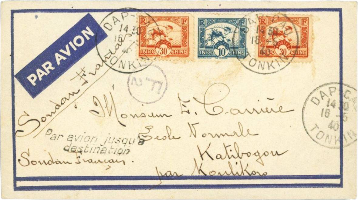 Thư hàng không gửi đi Sudan, chuyển tiếp qua Koulikoro, Mali (lúc này là thuộc địa Pháp với tên gọi French Sudan), áp dụng mức cước 70c, trong đó 10c cước thư thường <20g, 60c phụ thu hàng không <5g