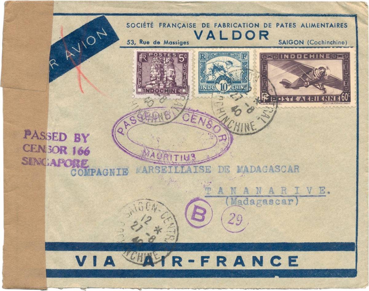 Thư hàng không gửi đi Tananarive, Madagascar 27/8/1940 áp dụng mức cước 75c, trong đó 10c cước thư thường <20g, phụ thu hàng không 65c trọng lượng <5g