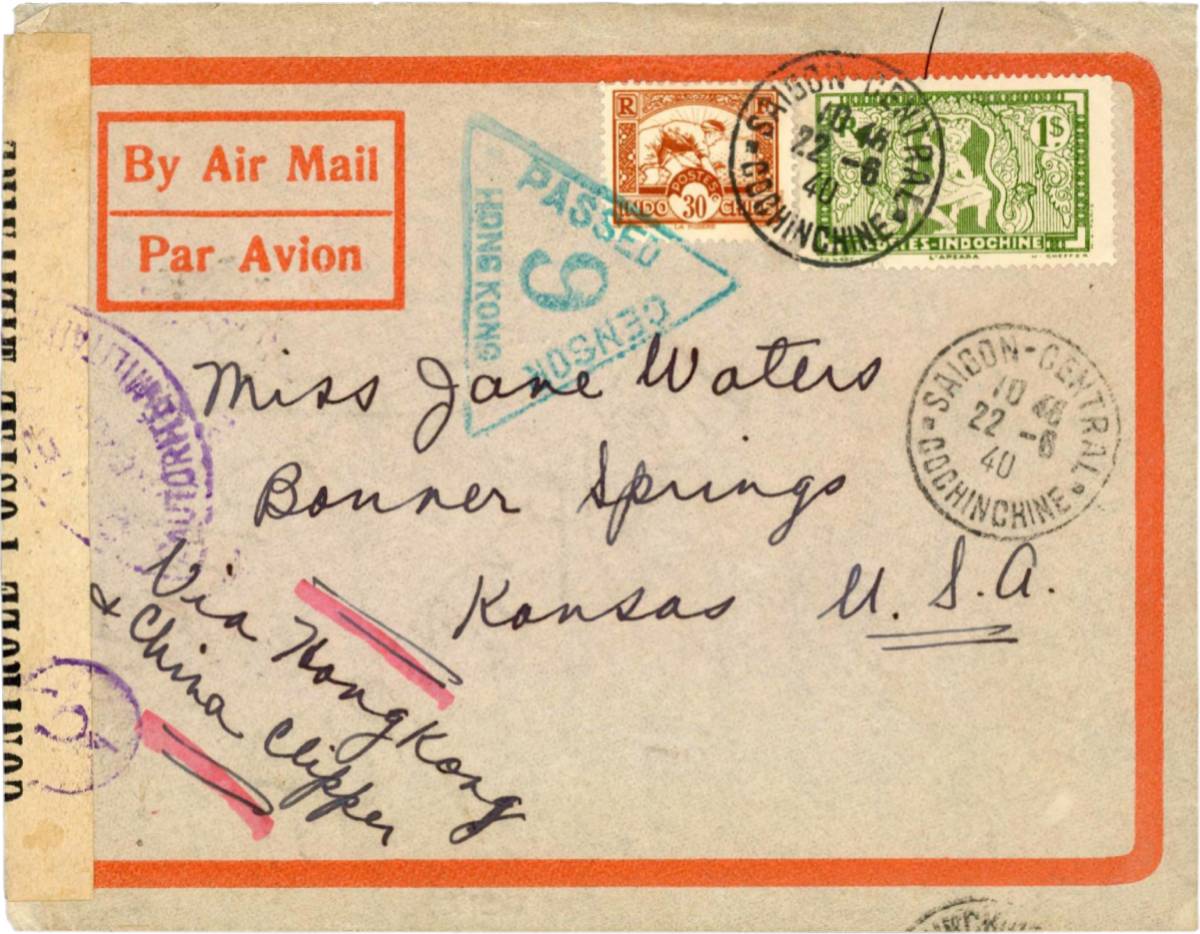 Thư gửi từ Sài Gòn, transitted Hongkong, “via Clipper service” áp dụng phụ thu hàng không 105c cho 5g đầu, cước thư thường 25c đi quốc tế. Tổng cộng 130c