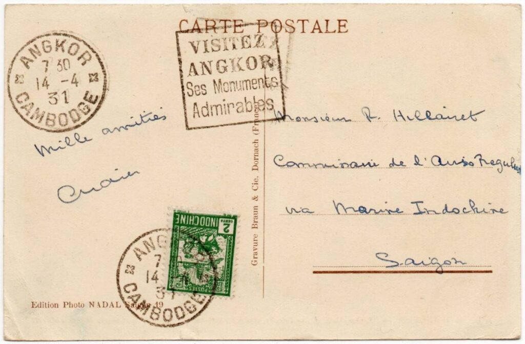 Hình 1: Bưu ảnh gửi từ Angkor đi Sài Gòn 14/4/1931 đóng dấu slogan VISITEZ ANGKOR Ses Monuments Admirables