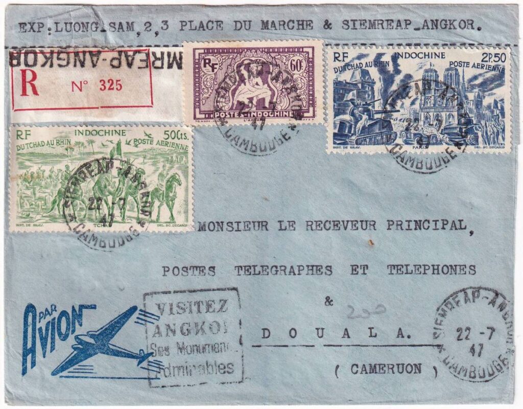Hình 2: Bì thư gửi từ SieamReap-Angkor đi Cameruon 22/7/1947 đóng dấu slogan VISITEZ ANGKOR Ses Monuments Admirables