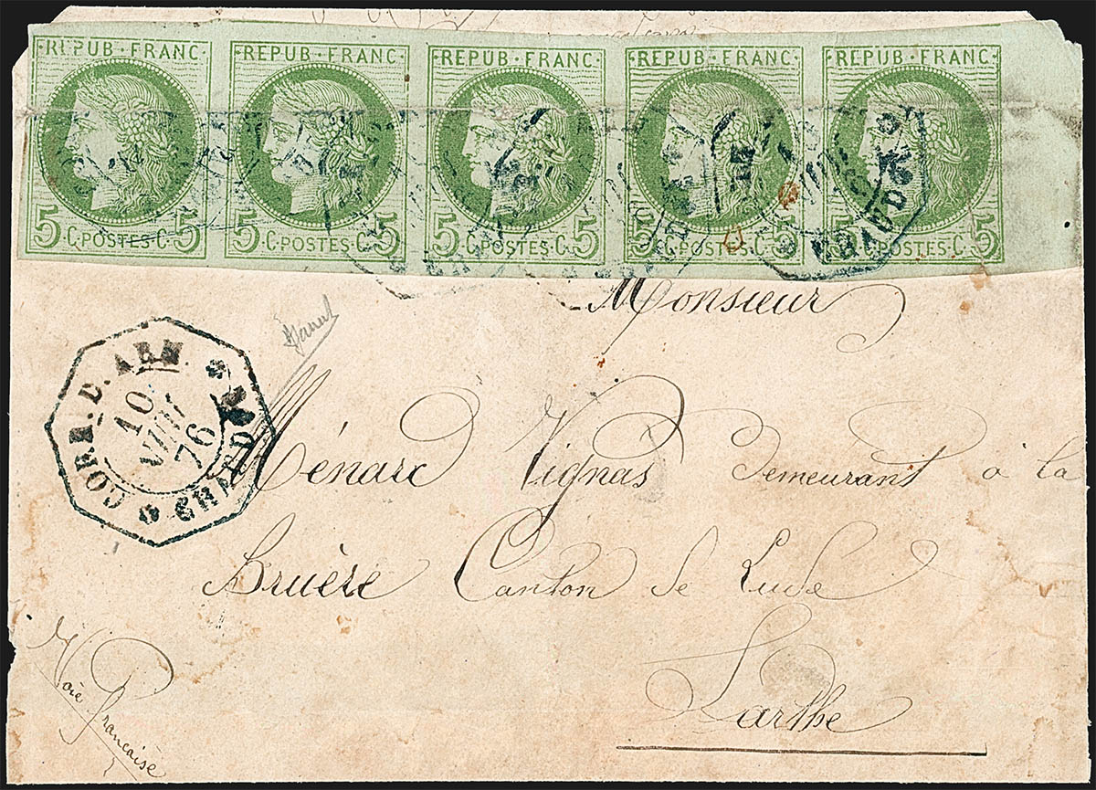 | Thư | 26/1/1876 | Đen | 5 tem Cerès 5c hủy bởi dấu CCN7 |