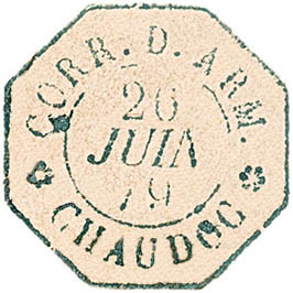 Dấu quân đội CORR.D.ARM CHAUDOC ngày 26/6/1879 màu xanh