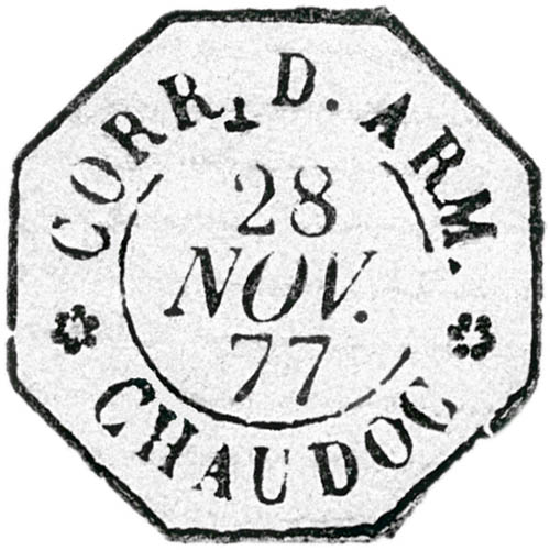 | Thư | 26/6/1879 | Xanh | 10c Cerès số lớn và 5c Sage, hủy bởi dấu nhật ấn nhật ấn CORR.D.ARM CHAUDOC |