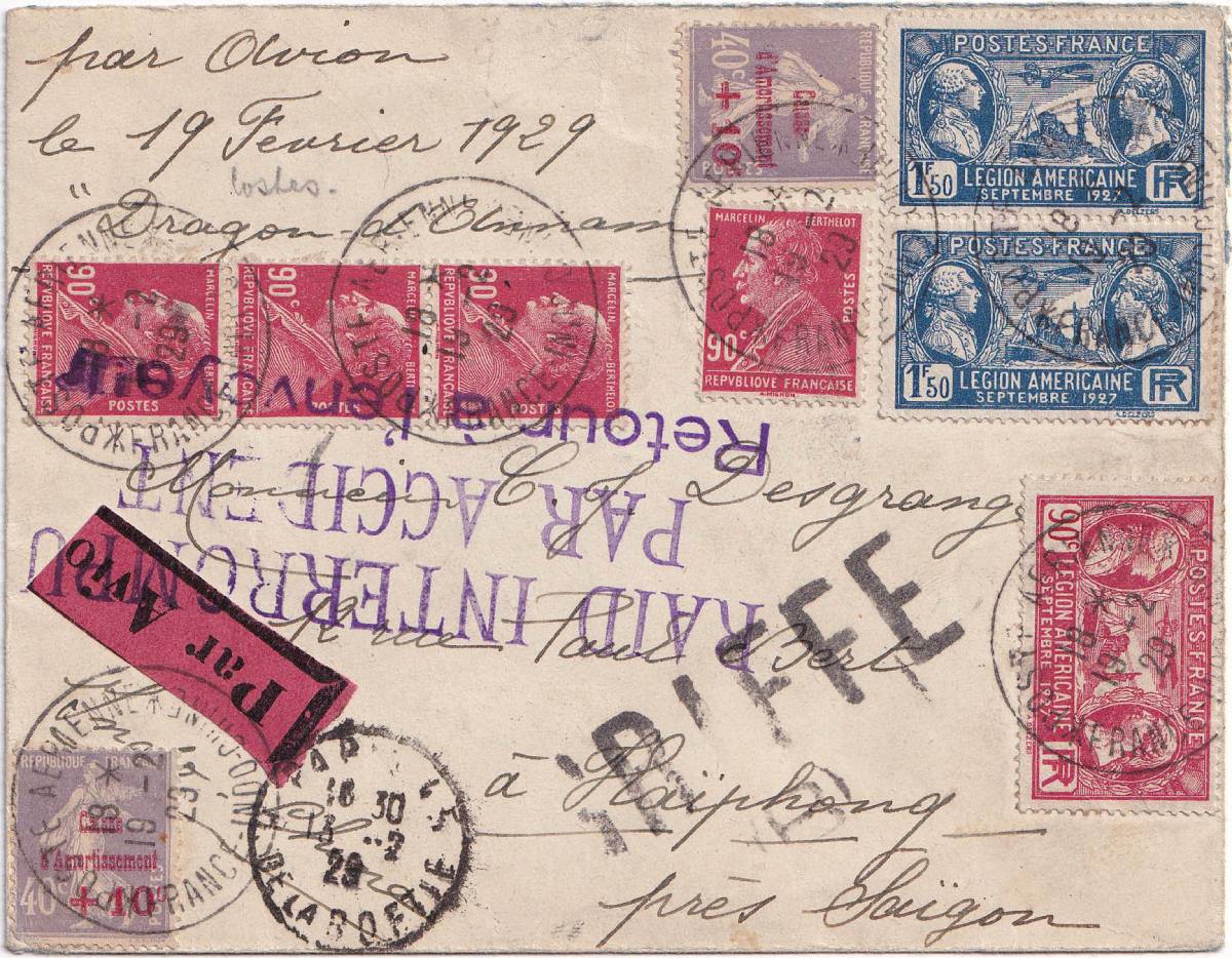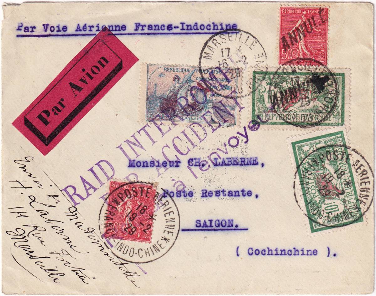 Bưu điện sản xuất riêng con dấu phục vụ cho chuyến bay, trên đó khắc dòng chữ: “POSTE ARIENNE FRANCE-INDOCHINE” 18h ngày 19/2/1929, đó là giờ bay chứ không phải là giờ nhận thư vì máy bay cất cánh lúc 17h53 cùng ngày.