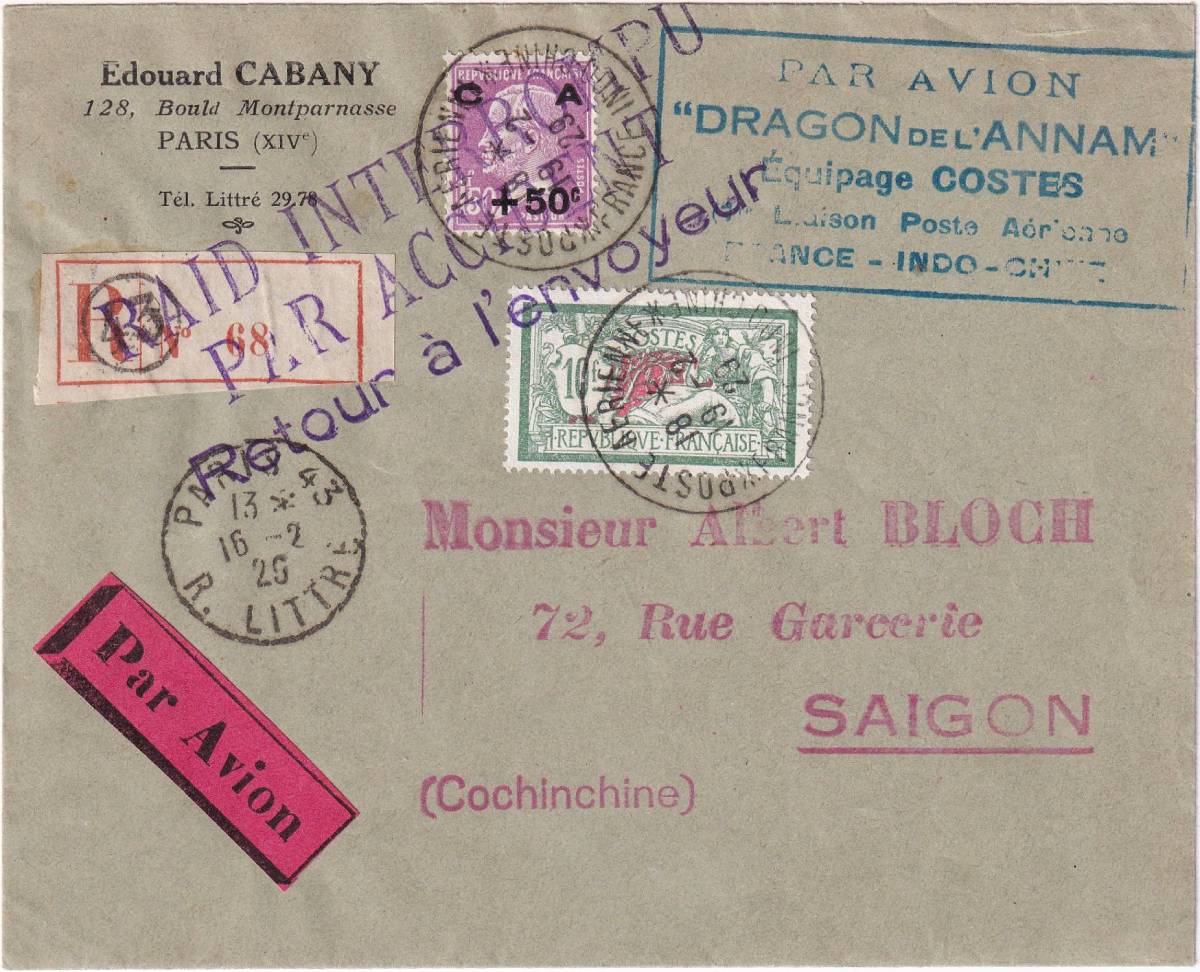 Edouard CABARY là một công ty kinh doanh tem chơi và danh mục tem (stamp catalogue), họ làm riêng con dấu cho chuyến bay này, nó có màu xanh với dòng chữ: PAR AVION “DRAGON de l’ANNAM” Équipage COSTES 1re Laison Poste Aérienne FRANCE INDOCHINE. Đây là dấu tư nhân chứ không phải dấu bưu điện sản xuất.