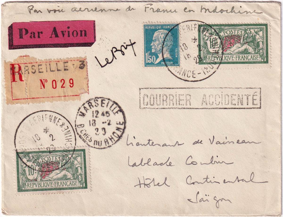 Sau khi rơi tại gần Rangoon, Le Brix đã mang số thư lên tàu hỏa tới PnomPenh rồi bay bằng đường hàng không tới Sài Gòn (thông tin này chưa kiểm chứng được bởi chưa có chuyến bay từ PnomPenh tới Sài Gòn lúc này). Dấu đến mặt sau đóng tại bưu cục Saigon Central ngày 8/3/1929.