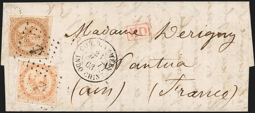 Nhật ấn COR.D.ARMÉES | INDO-CHINE 23/8/1863 cùng với dấu hủy tem diamond lozenge mỏ neo trên bì thư gửi từ Shanghai đi Pháp