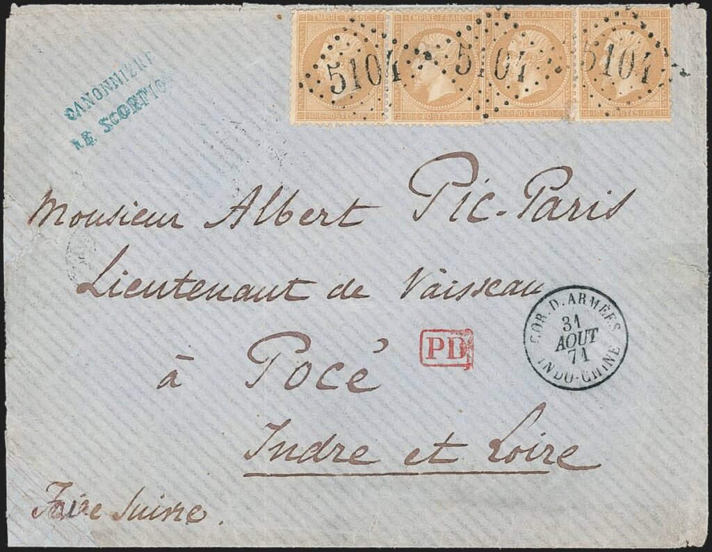 Nhật ấn COR.D.ARMÉES | INDO-CHINE 31/8/1871 cùng với dấu hủy tem diamond lozenge, số 5104 ở giữa, gửi từ Shanghai đi Loire, Pháp