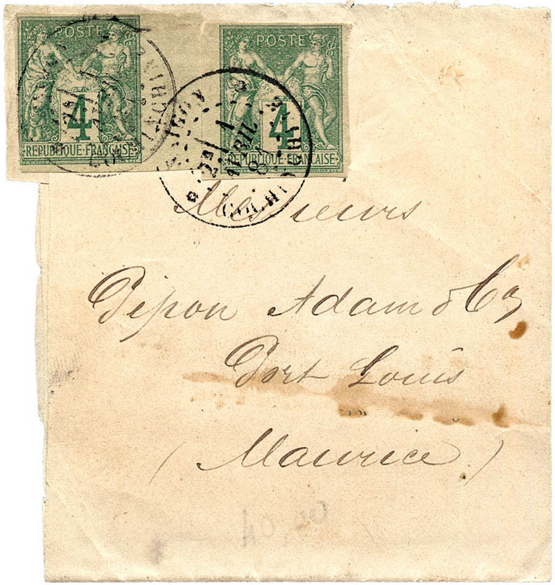 Imprimés gửi từ Sài Gòn đi Maurice (thuộc địa Anh) ngày 1/4/1881 áp dụng mức cước 8c, dán bởi 2 tem Sage 4c