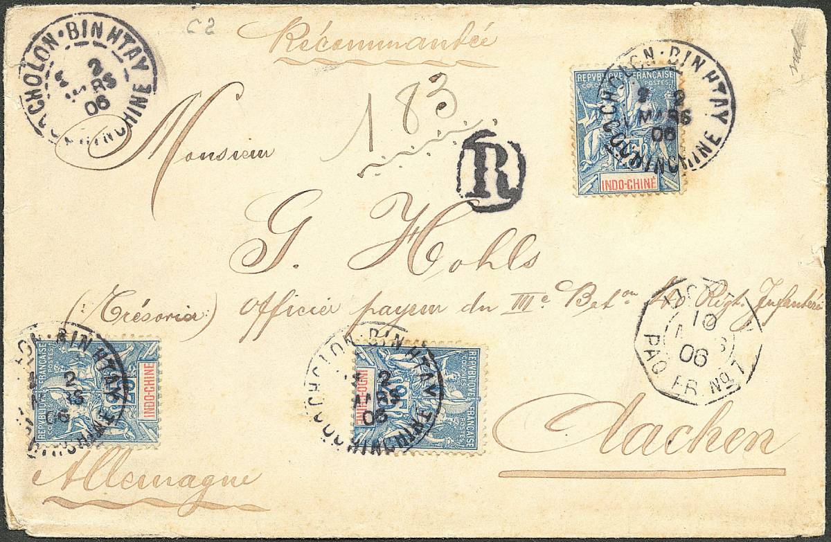 Thư gửi từ bưu cục Chợ Lớn Bình Tây đi Aachen, Allemagne (Đức) ngày 2/3/1906, cước thư thường 50c (25c mỗi 15g) + 25c phí bảo đảm. Tổng: 75c