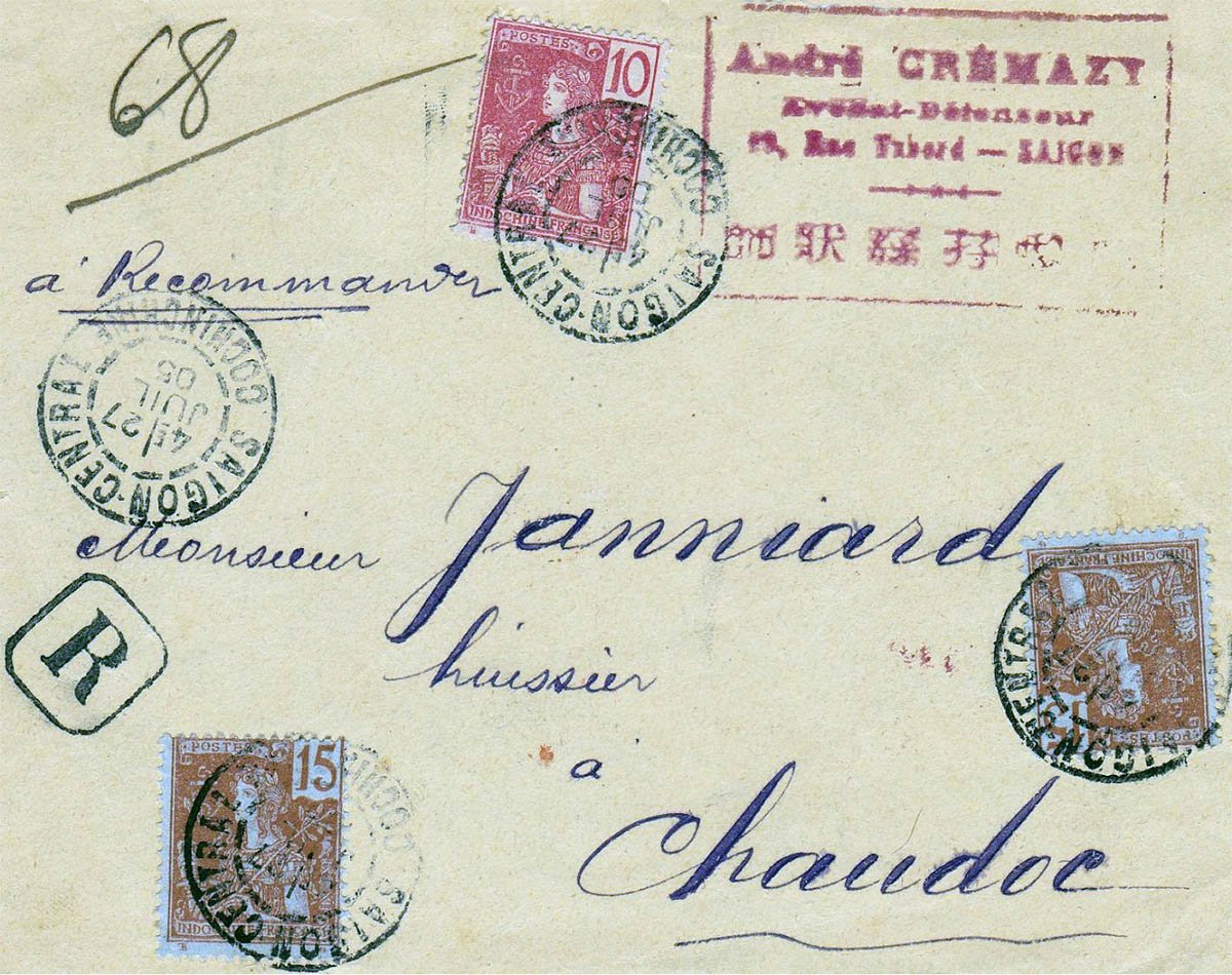 Thư bảo đảm gửi từ Sài Gòn đi Châu Đốc 27/7/1905, mức cước 40c (15c thư thường + 25c bảo đảm)