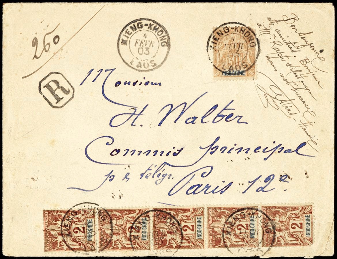 Thư bảo đảm gửi từ Xieng-Khong, Lào đi Paris 4/2/1903, mức cước 40c (15c thư thường + 25c bảo đảm)