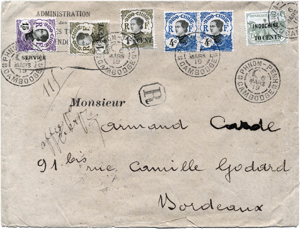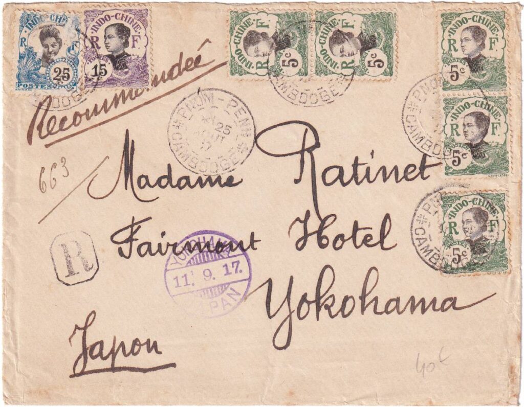 Gửi từ PnomPenh đi Yokohama 25/8/1917, cước gửi quốc tế 20g đầu 25c, 20g tiếp 15c, phí bảo đảm 25c. Tổng cộng 65c