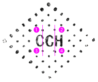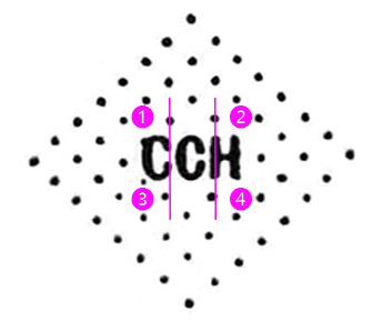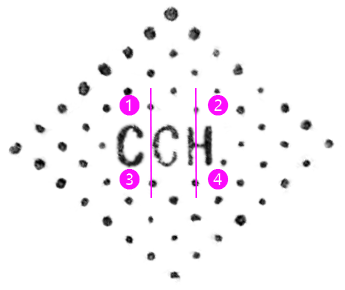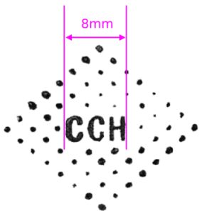 Viên kim cương Dạng 1 và Dạng 3 có vị trí các chấm không thay đổi, khi đặt chồng lên nhau trùng khớp 100%. Tuy nhiên, chữ CCH Dạng 1 lệch sang trái khoảng 1mm so với Dạng 3.