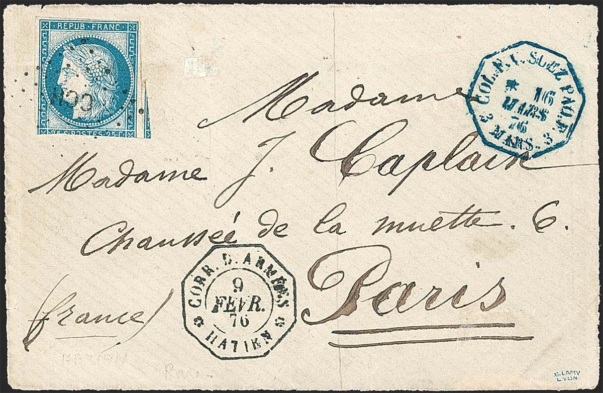25c Cèrés bị hủy bởi dấu nhật ấn quân đội CORR.D.ARMÉES Hà Tiên trên một bì thư gửi đi Pháp ngày 10/2/1878