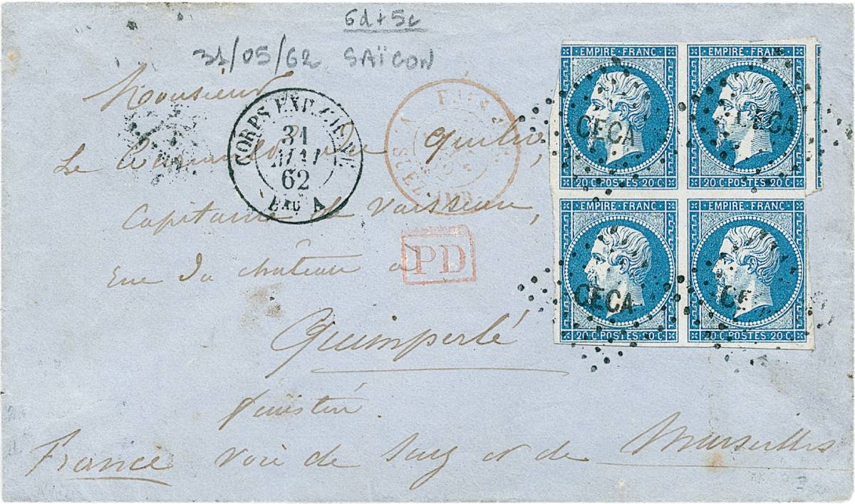 Block of four, mostly large margins to touching a couple places, tied by four strikes of dotted “CECA” cancel with “Corps Exp. Chine Bau A 31 Mai 62” double-circle datestamp on blue cover to Quimperle, France, sender’s directive “voie de Suez et de Marseilles”, red framed “PD” handstamp, red “Pays Etr. Suez Amb. 12 Juil 62” double-circle entry datestamp, backstamped Paris, Nantes and Quimperle (Jul. 13-16).