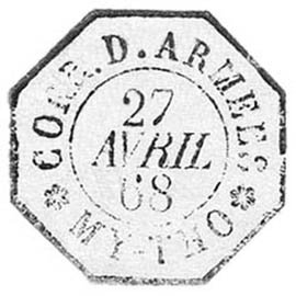 Tiêu đề CORR.D.ARMÉES ở trên, tên bưu cục ở dưới, nằm song song với cạnh lục giác