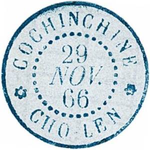 Nhật ấn hình tròn, bên trên là chữ COCHINCHINE, bên dưới là tên bưu cục