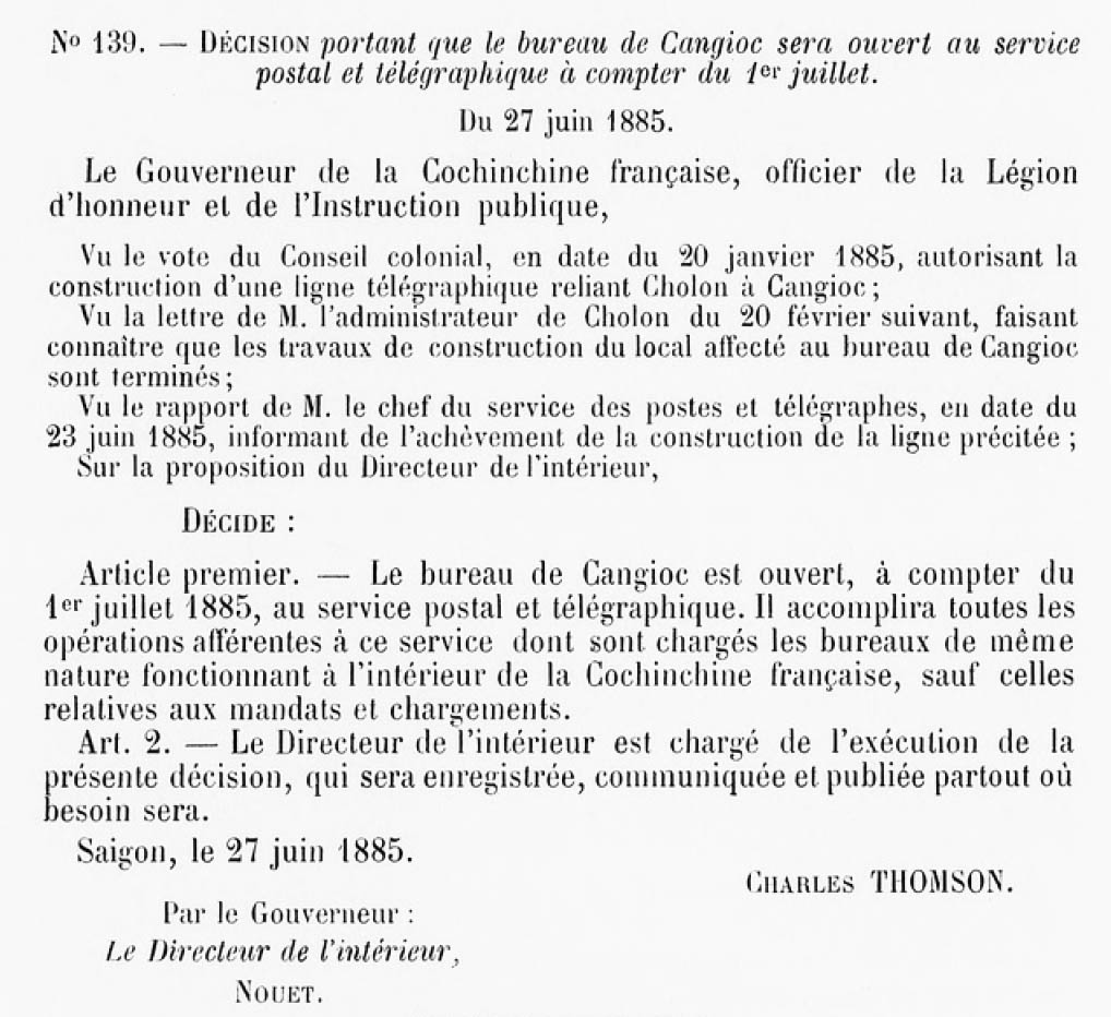 Home » Quyết định số 139 của Thống đốc Nam Kỳ về việc thành lập bưu cục Cần Giuộc (Cangioc) ngày 1/7/1885