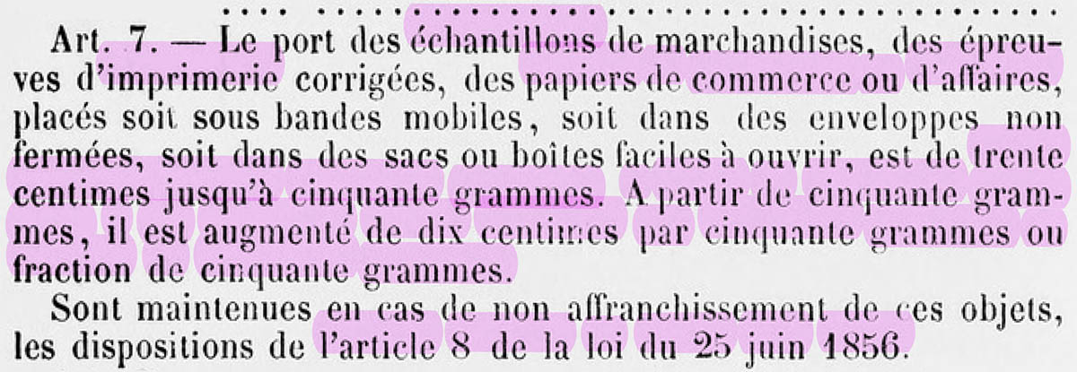 Điều 7, Luật Bưu chính Pháp ngày 24/8/1871 quy định trường hợp imprimés, échantillons, papiers d\’affaires gửi đi nhưng không dán tem sẽ bị áp dụng mức 30c cho trọng lượng dưới 50g; từ 50g trở lên tính 10c cho mỗi 50g. Đây là quy định mới bởi trước đó gửi imprimés, échantillons, papiers d\’affaires bắt buột phải dán tem.
