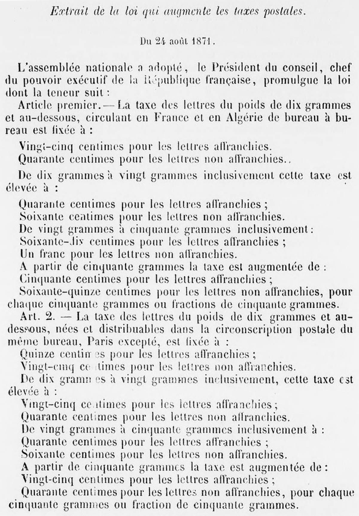 Còn trong Điều 1 và Điều 2, Luật Bưu chính Pháp ngày 24/8/1871 quy định mức cước thư nội địa tại Pháp và Algieria như sau: