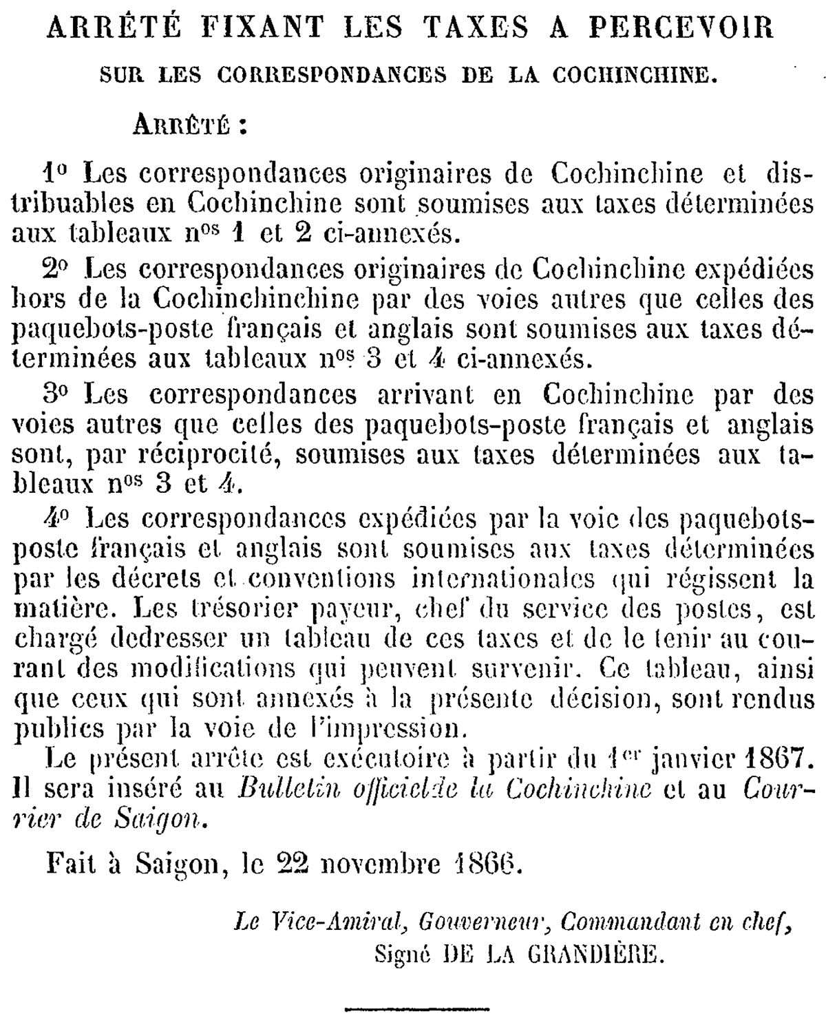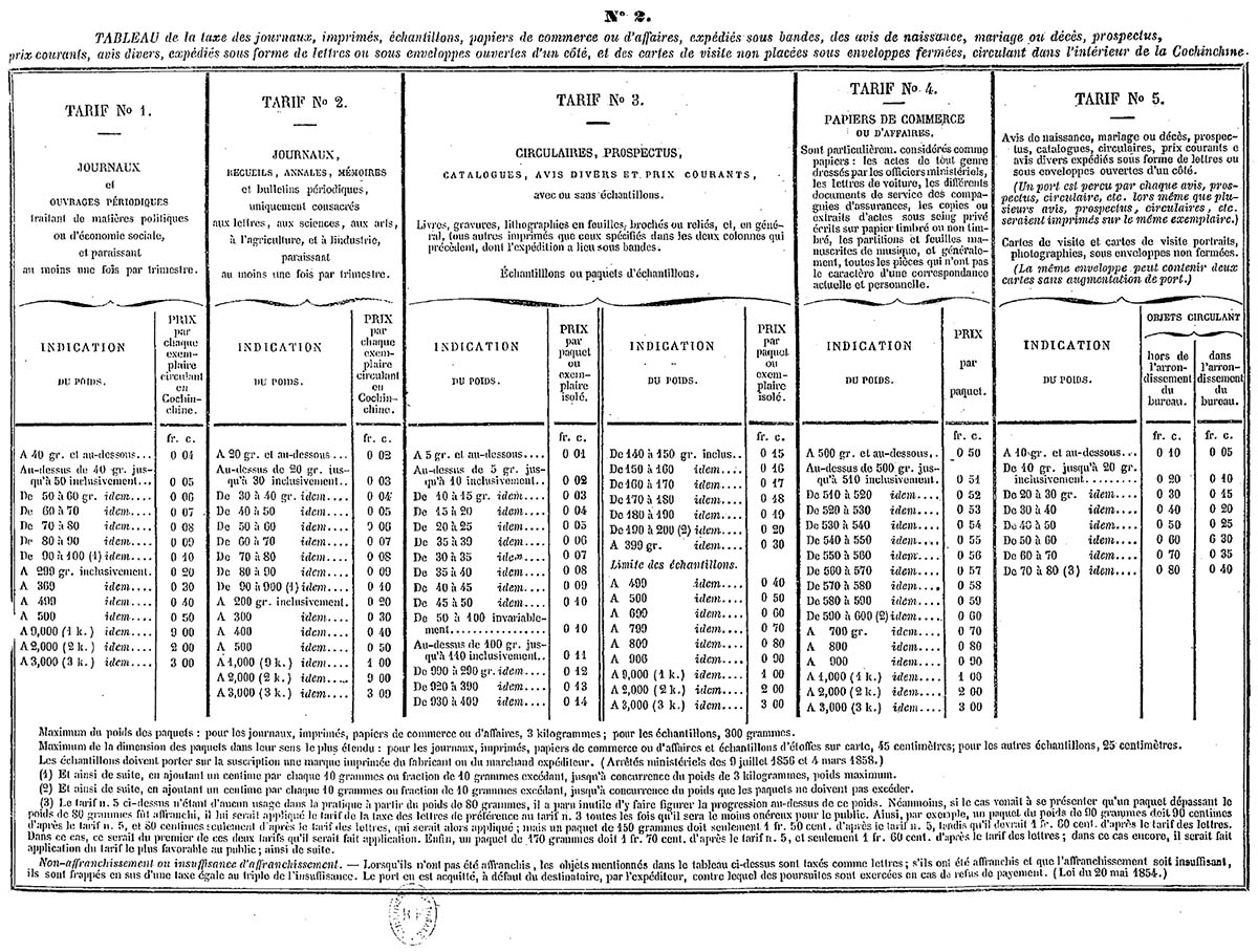 Sắc lệnh ban hành ngày 22/11/1866 và có hiệu lực tại Nam Kỳ kể từ 1/1/1867, bao trùm nhiều vật phẩm như: journaux (báo, tạp chí); imprimés; échantillons (hàng hóa, vật phẩm); papiers de commerce ou d\’affaires (giấy tờ kinh doanh). Dưới đây là bản chụp nguyên gốc tiếng Pháp và một số phụ lục.