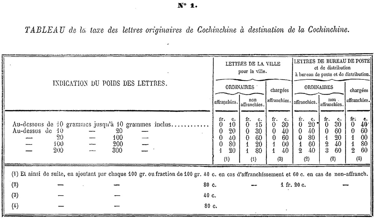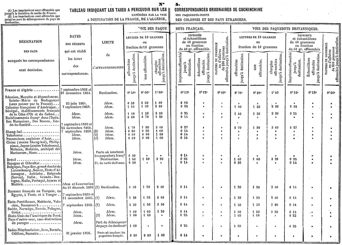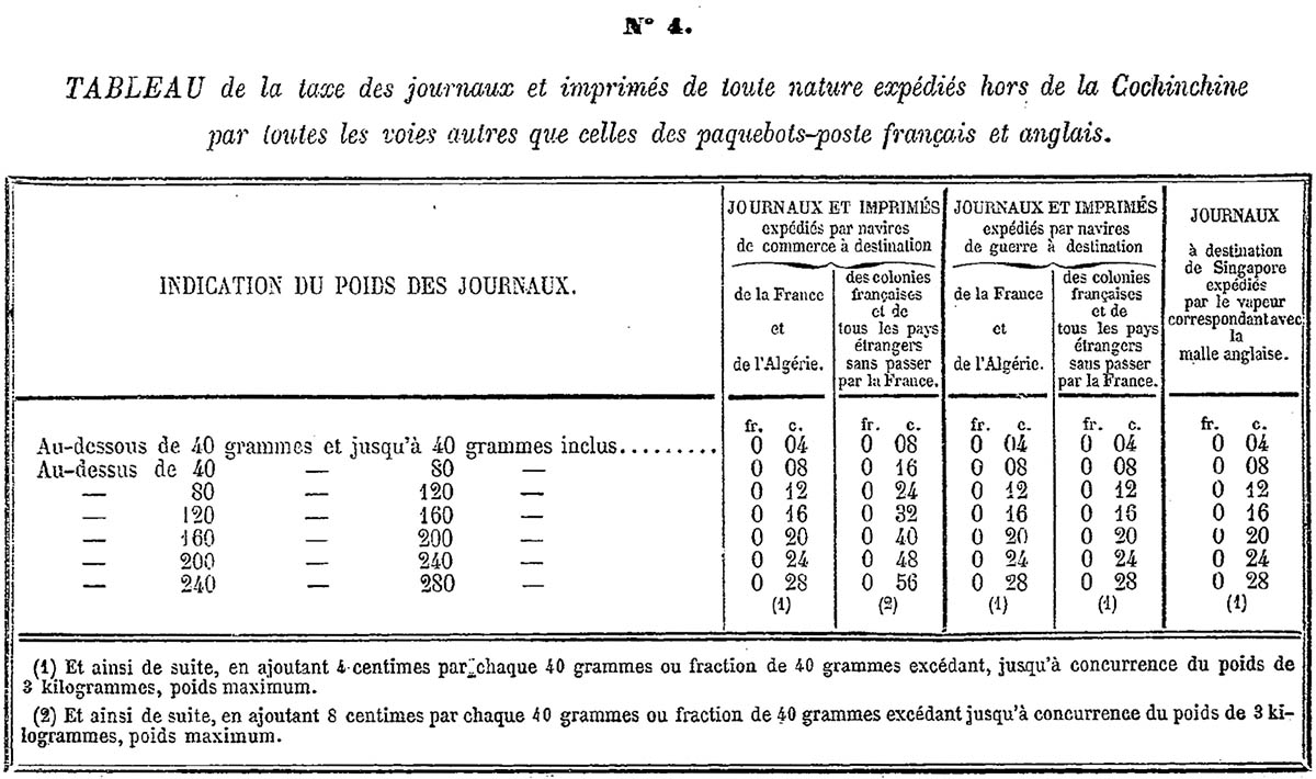 Phụ lục 3 hướng dẫn về cước gửi thư ra ngoài Nam Kỳ tới Pháp, Algieria và các thuộc địa bằng các tàu thương mại không phải đội tàu bưu chính của Pháp & Anh. Cước phí này không chính thống, các hãng tàu thường ủy thác cho thuyền trưởng thu phí dựa trên mỗi grams thư tại các điểm tàu cập bến rồi giao cho bưu điện nước sở tại.