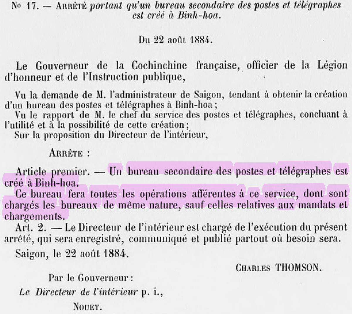 Ngày 22/8/1884, Giám đốc Nội vụ Nouet ký Sắc lệnh số 17 thành lập bưu cục cấp hai Binh-hoa để phân phát thư, bán tem và thu cước bưu chính tại địa phương này. Các dịch vụ bưu chính được triển khai ngoại trừ thư chuyển tiền mandats và thư bảo hiểm charge.