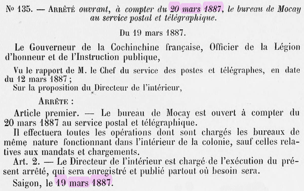 Ngày 20/3/1887, Giám đốc Nội vụ Pardon ký Sắc lệnh số 135 thành lập bưu cục Mõ Cày, thuộc tỉnh Vĩnh Long để phục vụ hoạt động thư tín và điện báo. Bưu cục sẽ thực hiện tất cả các nghiệp vụ thư tín trong nước và liên thuộc địa, ngoại trừ dịch vụ chuyển tiền (mandats) và thư bảo hiểm (charge) chưa được cấp phép.