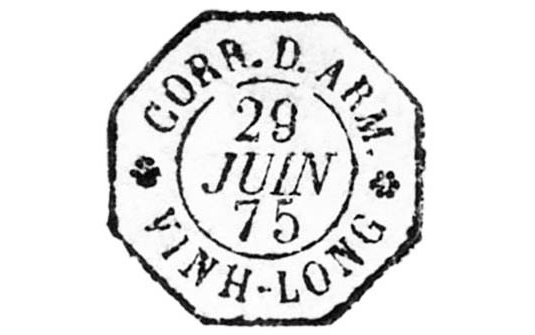 | Dạng 1 | CORR.D.ARM VINH-LONG | 1868-1877 | chữ VINH-LONG cách xa dấu hoa thị, các chữ cái trong mỗi từ gần nhau hơn, màu sắc có 2 màu: xanh lam và đen |