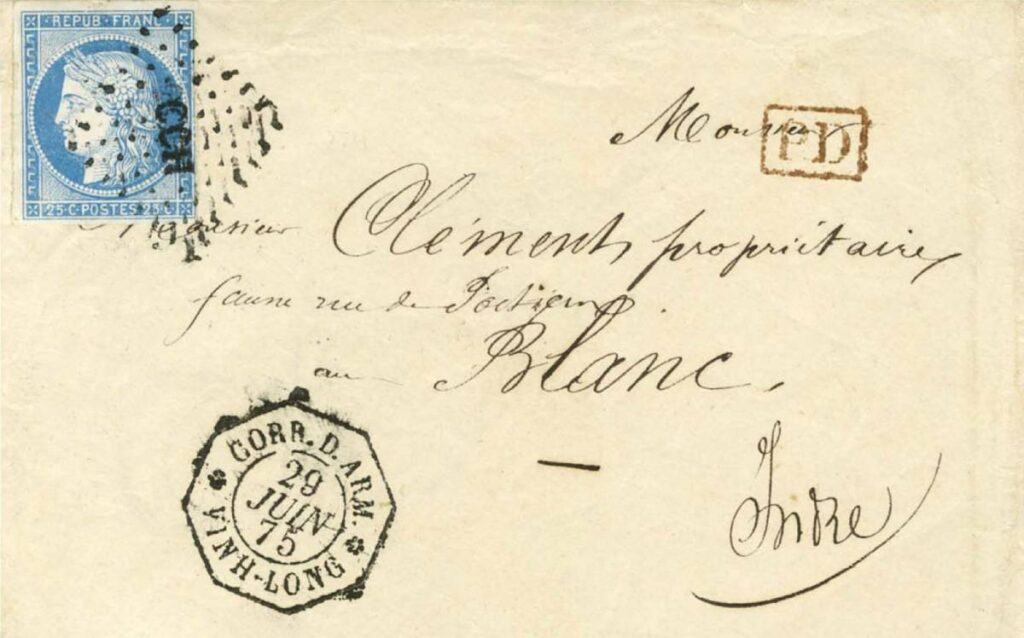 | Thư | 24/8/1876 | N/A | 15c Cerès số nhỏ và một cặp 5c Cerès hủy bởi dấu nhật ấn quân đội |